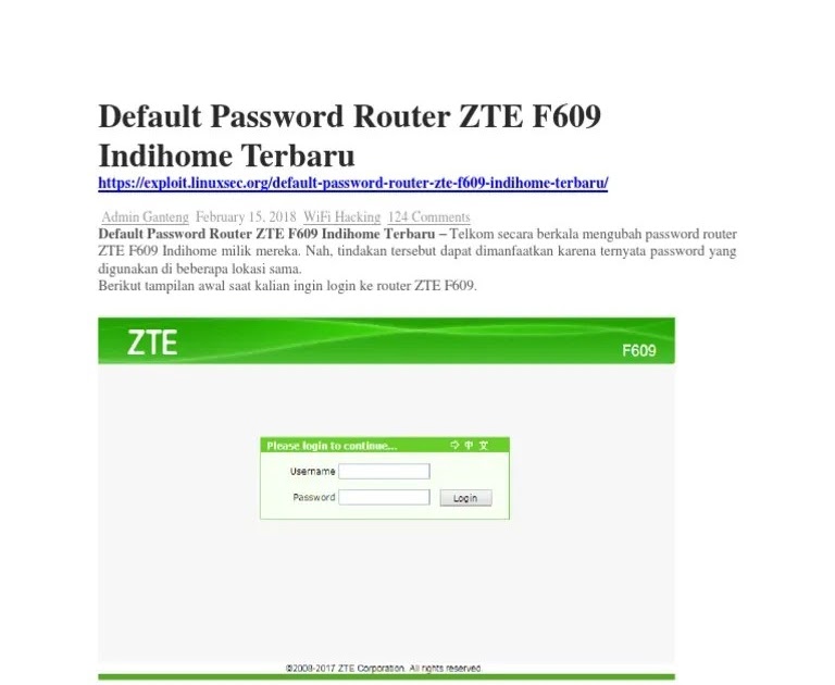 The default zte f609 router username is: Jul 31, 2017 · screenshot of zte f609 login. Mengetahui daftar user online di router zte f609. Jul 13, 2018 · baca juga: Tutorial mengganti password wifi pada router zte f609.