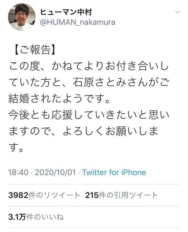 ç³åãã¨ã¿ã®çµå©ç¸æã¯gs æãããããæ¼«ç"»ã«æ³¨ç®ãéã¾ã£ã¦ãã¾ã Fumumu from img.fumumu.net Oct 01, 2020 · 女優の石原さとみ(33)が1日、所属事務所・ホリプロを通じて、同年代の一般男性と結婚することを発表した。同居はまだで、入籍は良き日を選んで年内にする予定。式・披露宴は未定としている。 書面で石原は「私事で大変恐縮ではありますが、この度、. Jun 19, 2021 · 石原さとみ(34)の主演ドラマ「恋はdeepに」(日本テレビ系)が6月9日に終了した。昨年末に一般男性と結婚してから最初の主演作ということも. May 12, 2021 · 石原さとみにとって結婚後初のドラマとなった『恋はdeepに』。だが視聴率はイマイチ。結婚後に成功した女優とつまづいた女優にはどんな違いがあるのだろう。各女性を分析すると意外な事実が浮かび上がってきた Jun 21, 2021 · 石原さとみ(34)の主演ドラマ「恋はdeepに」(日本テレビ系)が6月9日に終了した。昨年末に一般男性と結婚してから最初の主演作ということもあり、石原の新しい演技が見られるのではないかと、期待したファンも少なくなかったが、数字的には残念な結果に終わった。 Jun 15, 2021 · 昨年10月には同じ事務所の石原さとみが電撃結婚したことも、深キョンの心にさざ波を起こしていた。 「彼女は石原さとみ、綾瀬はるかと共に『ホリプロ3人娘』と呼ばれ、比較されてきました。 May 21, 2021 · 2020年に一般男性と結婚した石原さとみについて、女性セブンが伝えた。独身時代のマンションに帰宅しており、周囲から「別居婚か」と心配する. Oct 10, 2020 · 10月1日に結婚を発表した石原さとみ(33才)。本人は周囲に「普通のサラリーマンです」と語っているようだが、石原の知人によれば、「かなりのエリートサラリーマン」とも。 Oct 09, 2020 · 石原さとみ結婚で、同僚・深田&綾瀬の結婚は遠のいたか 多忙の石原さとみ、癒し求めて山下智久を自宅に呼び寄せる 【動画】石原さとみがトロ~ン…泥酔しちゃった現場 石原さとみ結婚 「このタイミングでの発表」に物議 三浦春馬、死の1か月前に本名の名字を変えていた